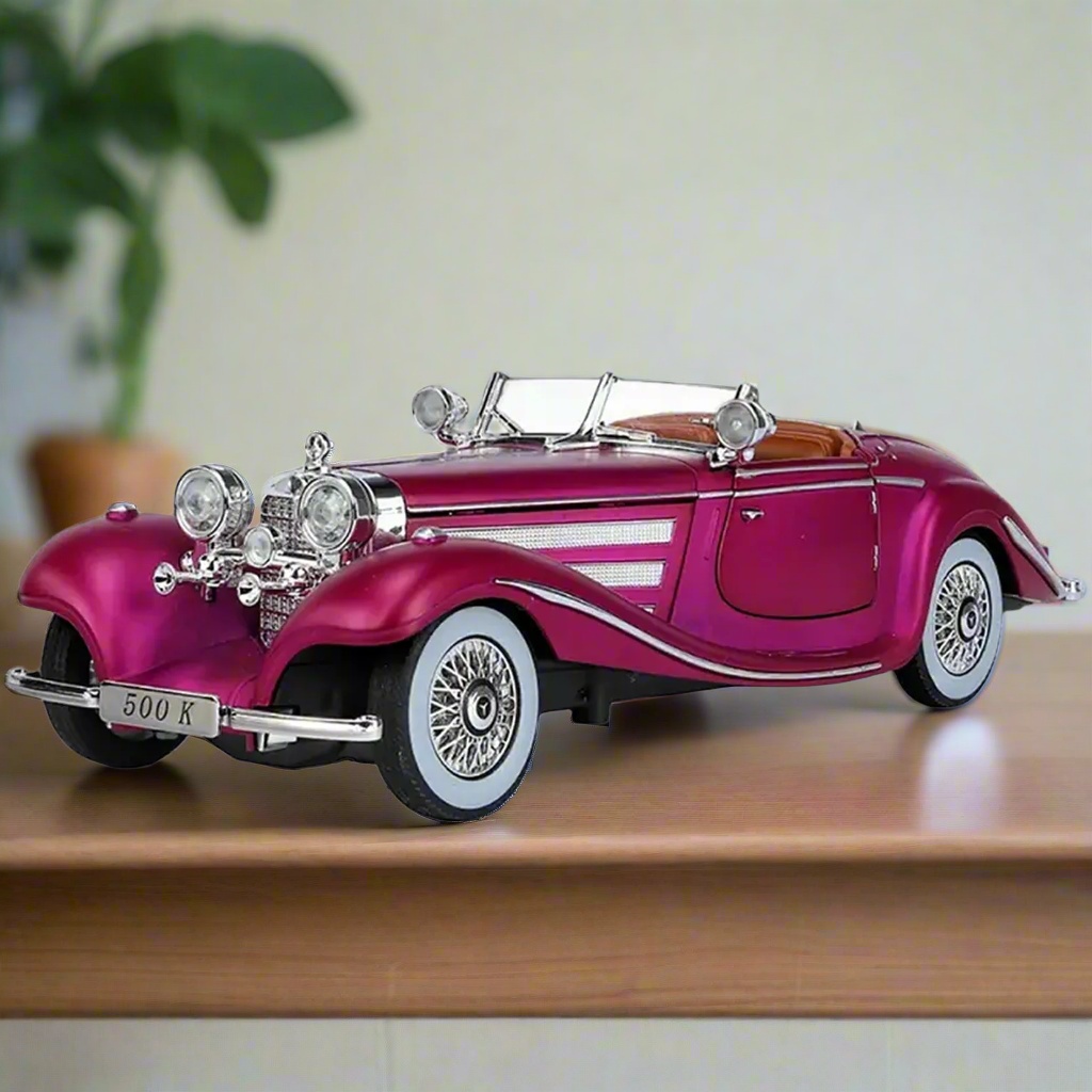 Classic vintage-style diecast toy car made of metal, featuring lights and sound. A perfect collectible or gift for kids and retro car lovers of all ages.